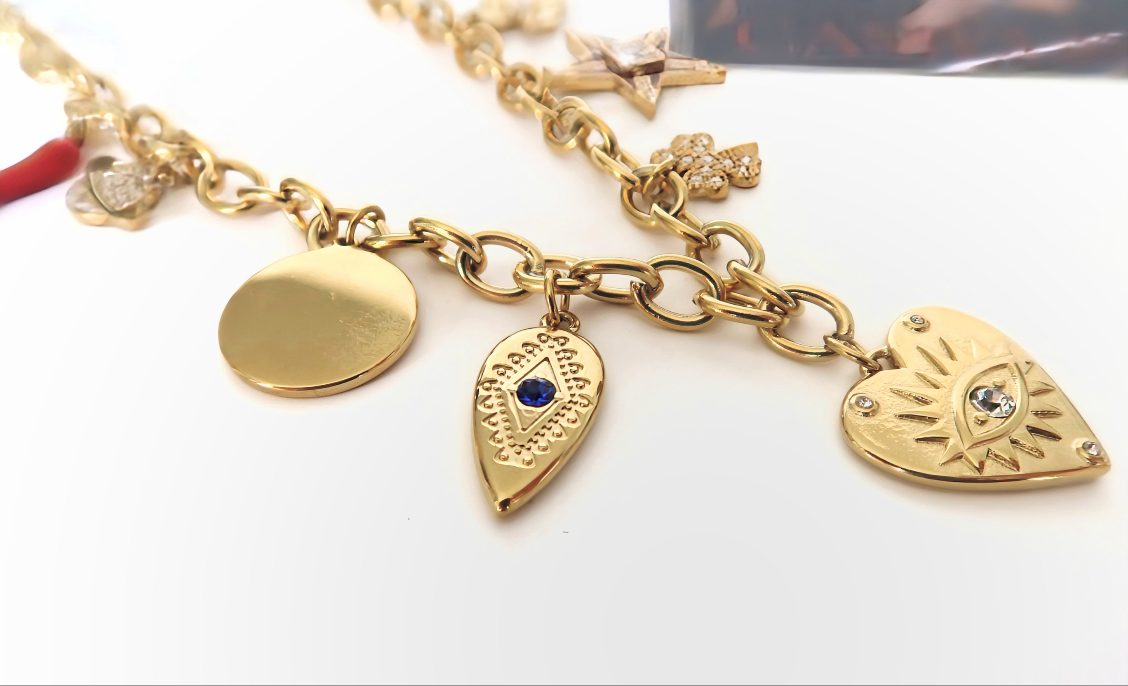 Collier en acier inoxydable avec plusieurs pendentifs. Ce collier très tendance apporte une note de modernité et d'élégance à vos tenues. Il est résistant à l'eau.
