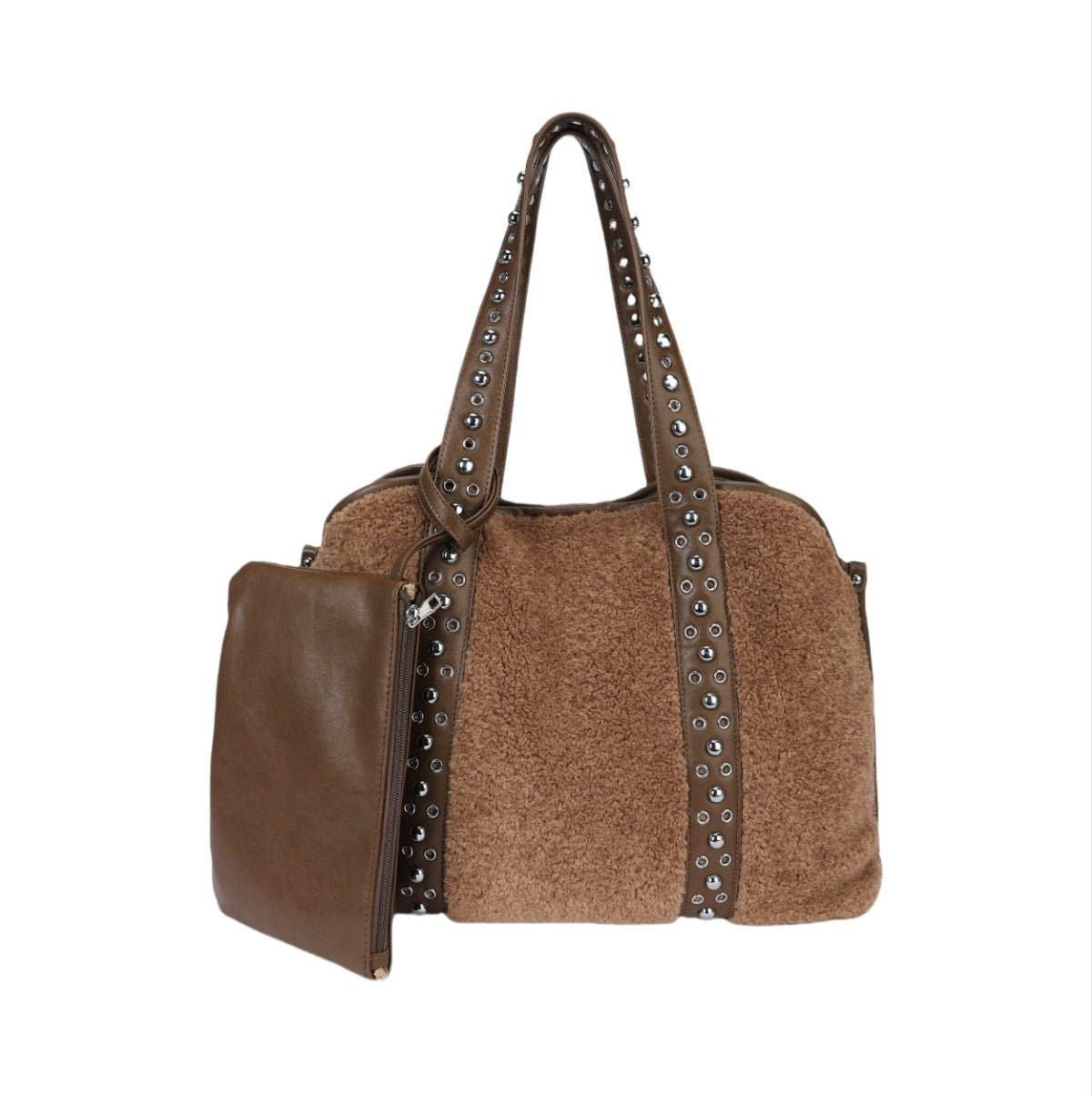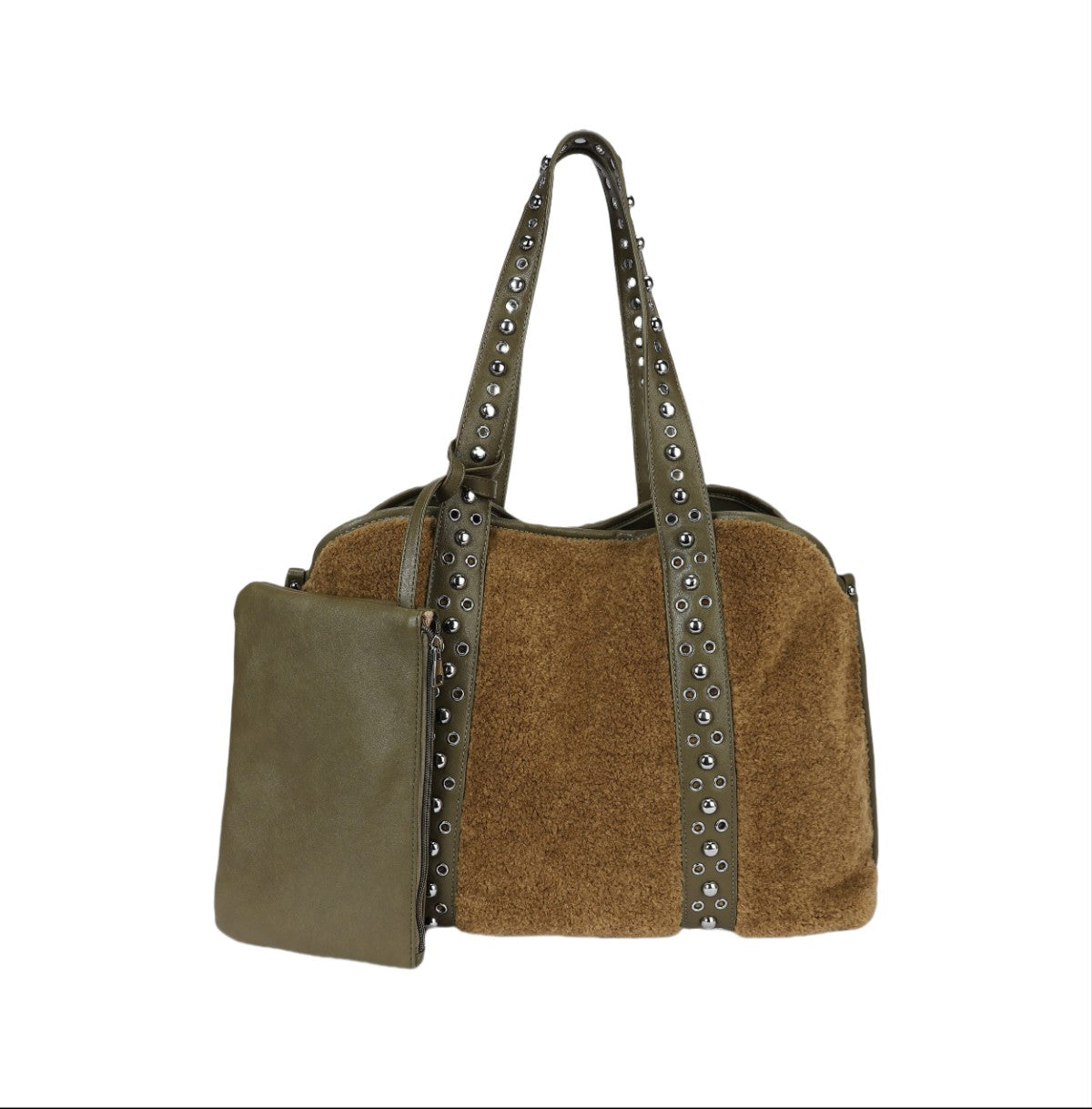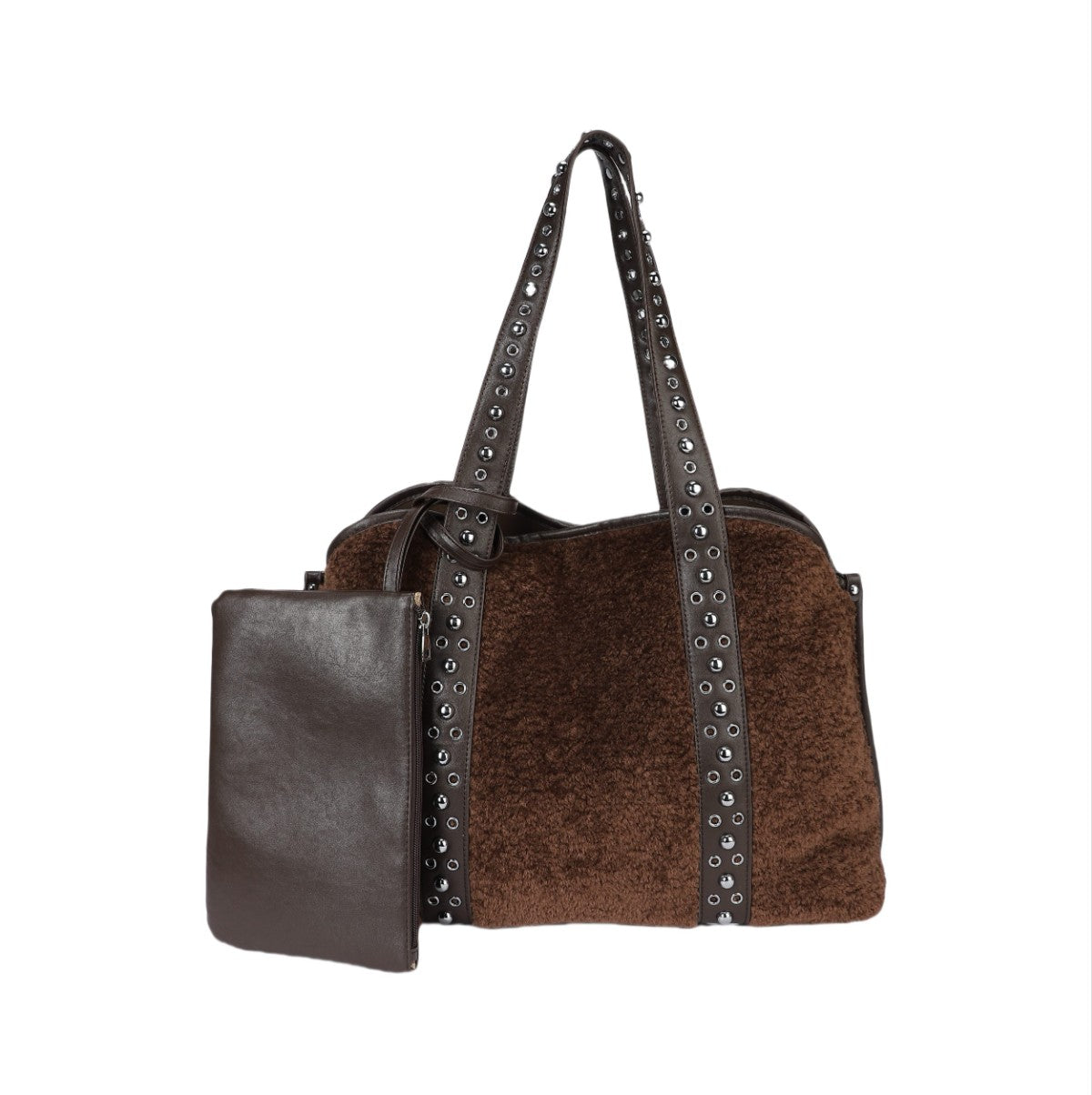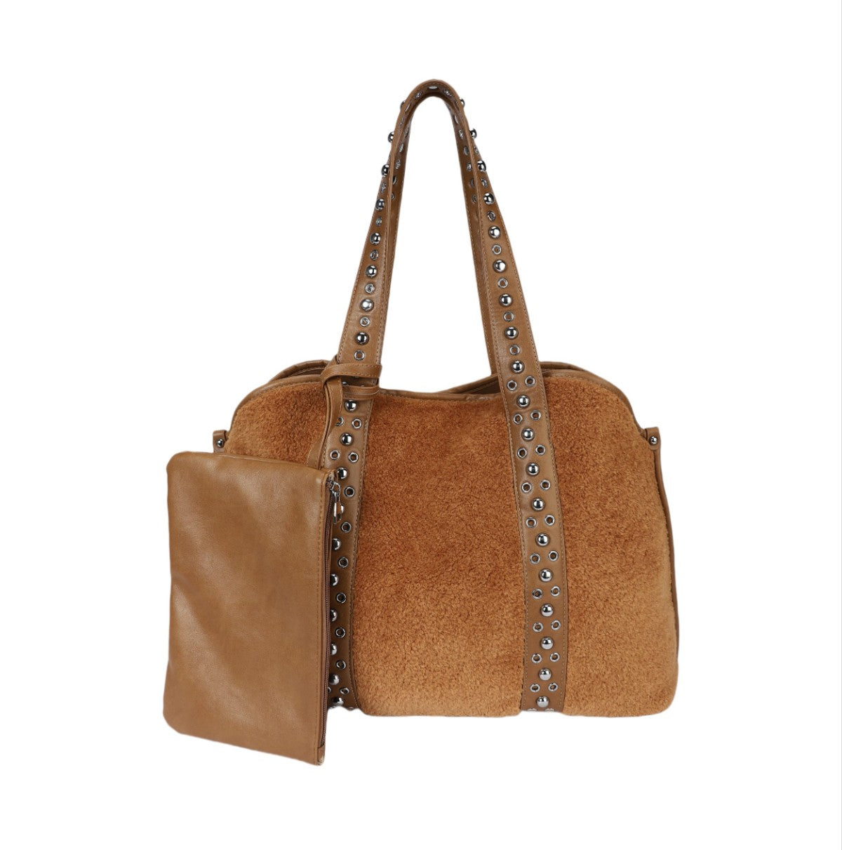 Ce sac cabas au design ample et distinctif est un accessoire idéal pour celles qui recherchent une touche de personnalité. Réalisé dans une matière souple à la texture effet poney ou velours côtelé fin, il présente un corps spacieux et polyvalent. Sa principale caractéristique réside dans ses anses supérieures et ses profils verticaux ornés d'une rangée de clous métalliques argentés, qui lui confèrent un look audacieux et personnalisé. Le sac comprend une pochette plate assortie, reliée à l'extérieur par une sangle, parfaite pour organiser les petits objets ou pour être utilisée séparément. Un accessoire spacieux et tendance, idéal pour un usage quotidien ou pour voyager, avec une attention particulière portée aux détails qui lui confère un aspect « ultra-personnalisé ».