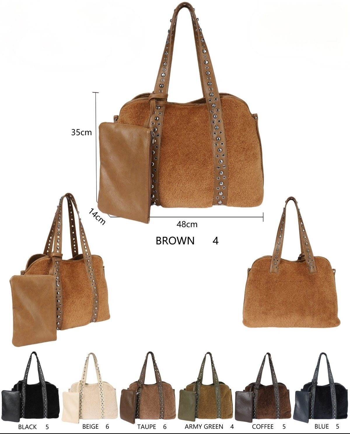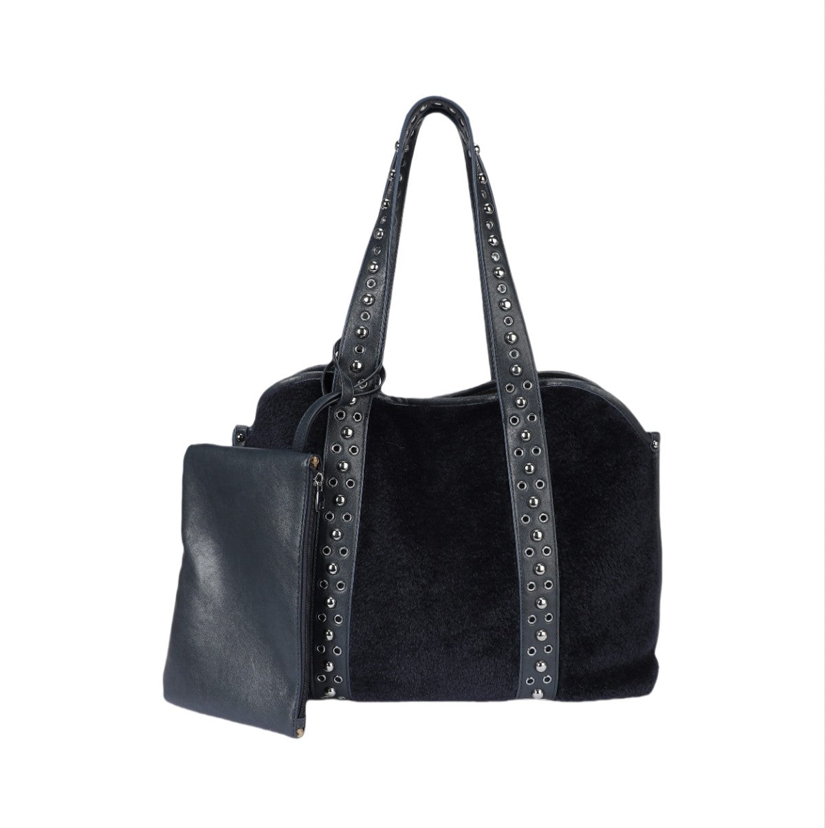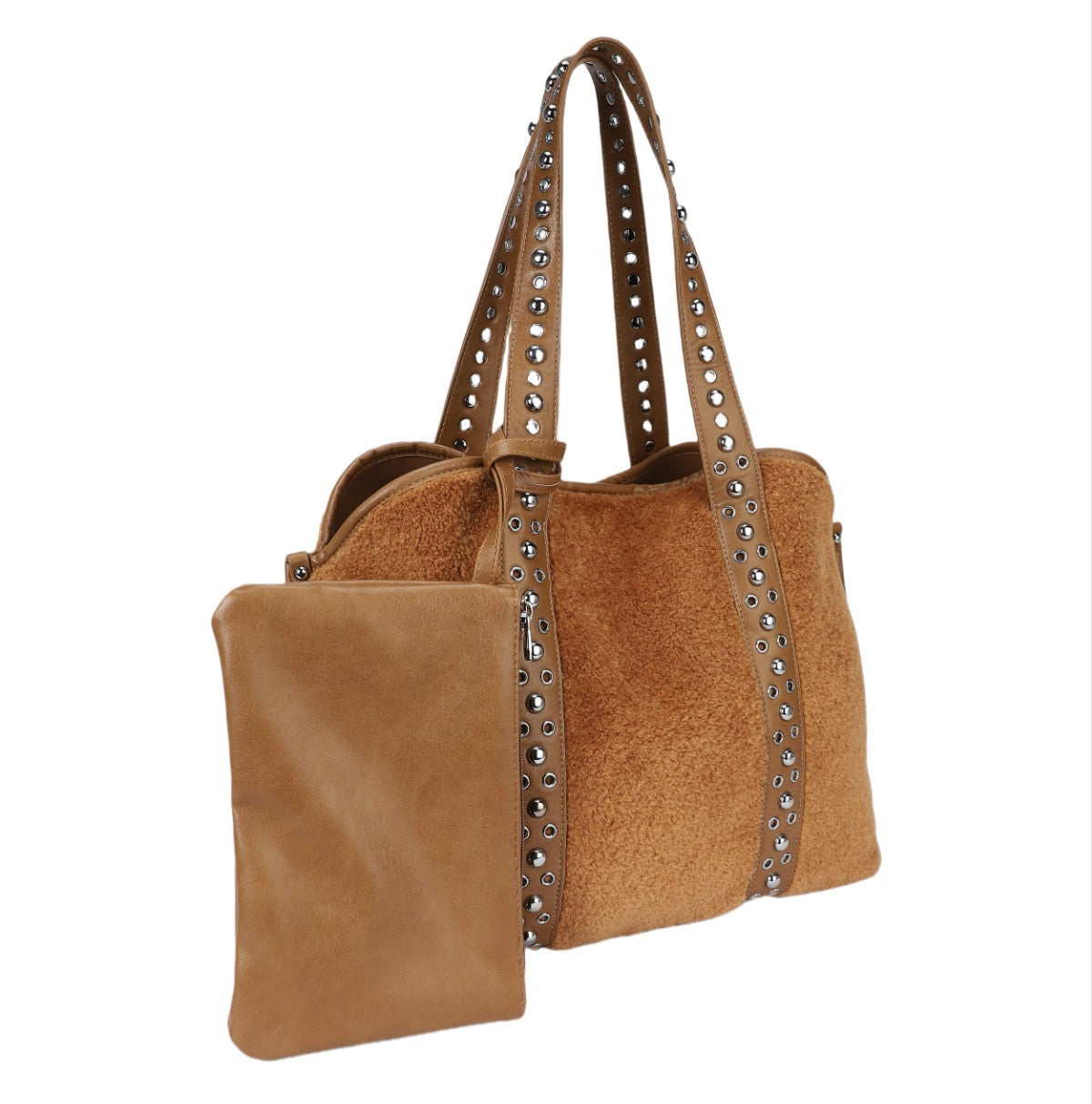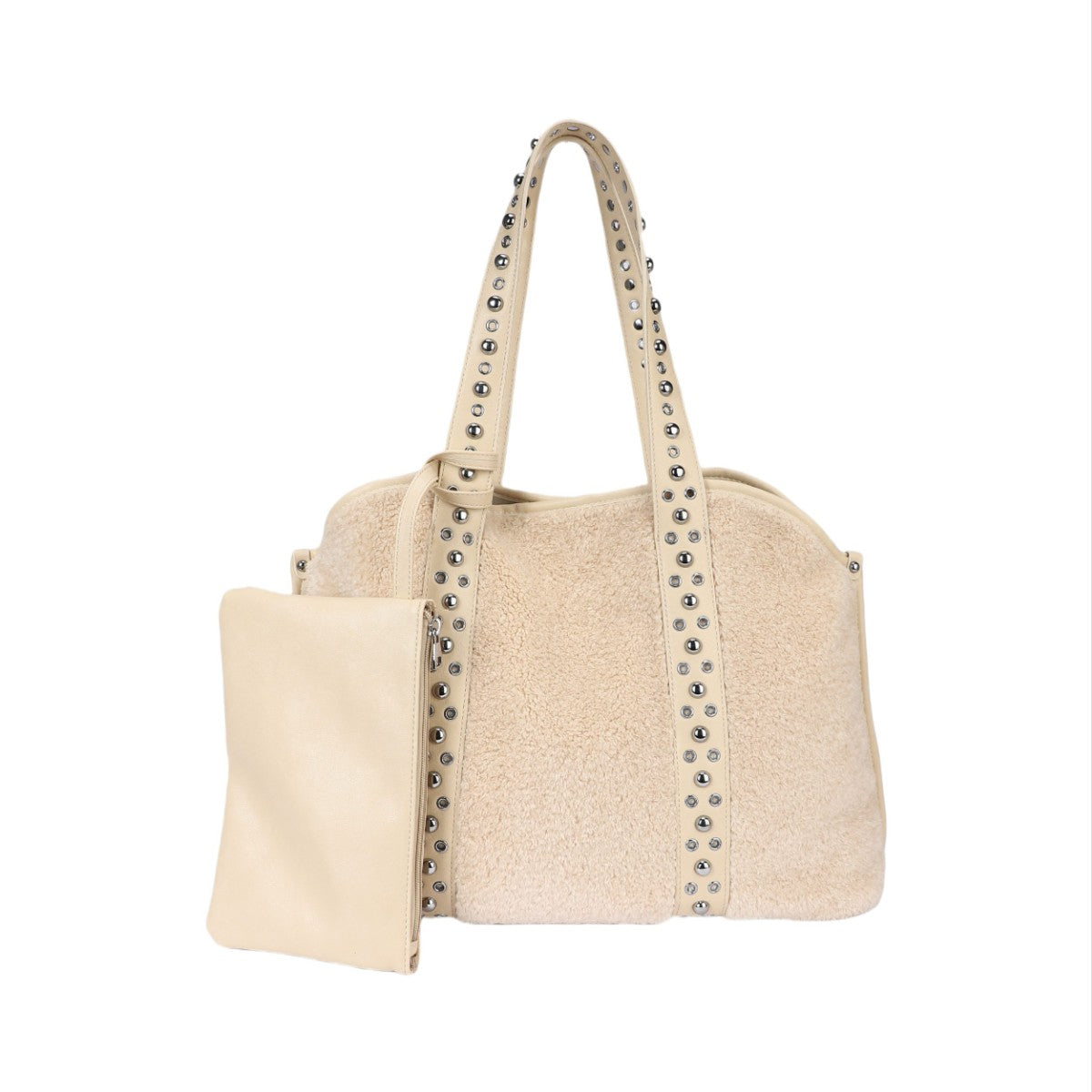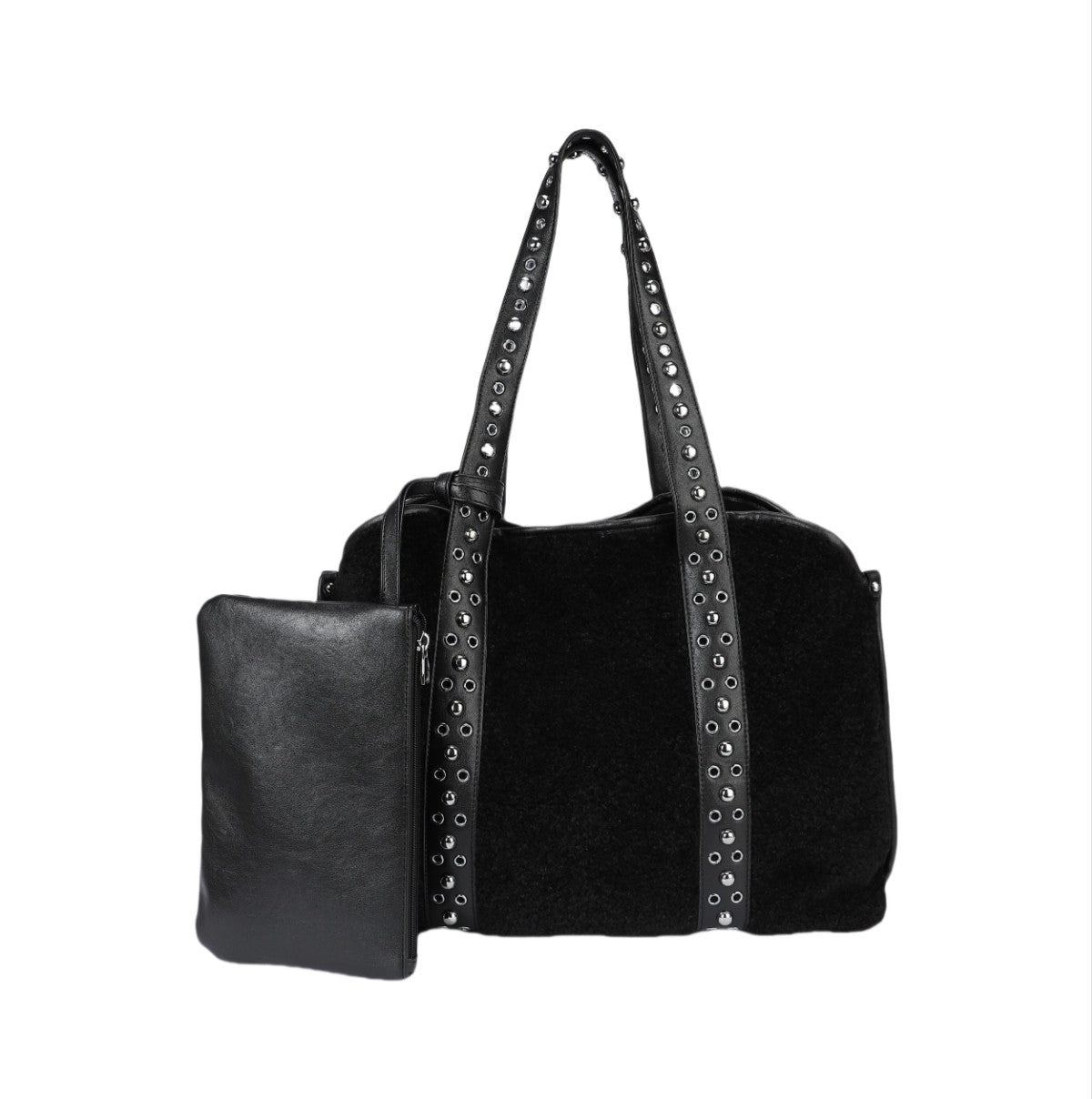 Ce sac cabas au design ample et distinctif est un accessoire idéal pour celles qui recherchent une touche de personnalité. Réalisé dans une matière souple à la texture effet poney ou velours côtelé fin, il présente un corps spacieux et polyvalent. Sa principale caractéristique réside dans ses anses supérieures et ses profils verticaux ornés d'une rangée de clous métalliques argentés, qui lui confèrent un look audacieux et personnalisé. Le sac comprend une pochette plate assortie, reliée à l'extérieur par une sangle, parfaite pour organiser les petits objets ou pour être utilisée séparément. Un accessoire spacieux et tendance, idéal pour un usage quotidien ou pour voyager, avec une attention particulière portée aux détails qui lui confère un aspect « ultra-personnalisé ».